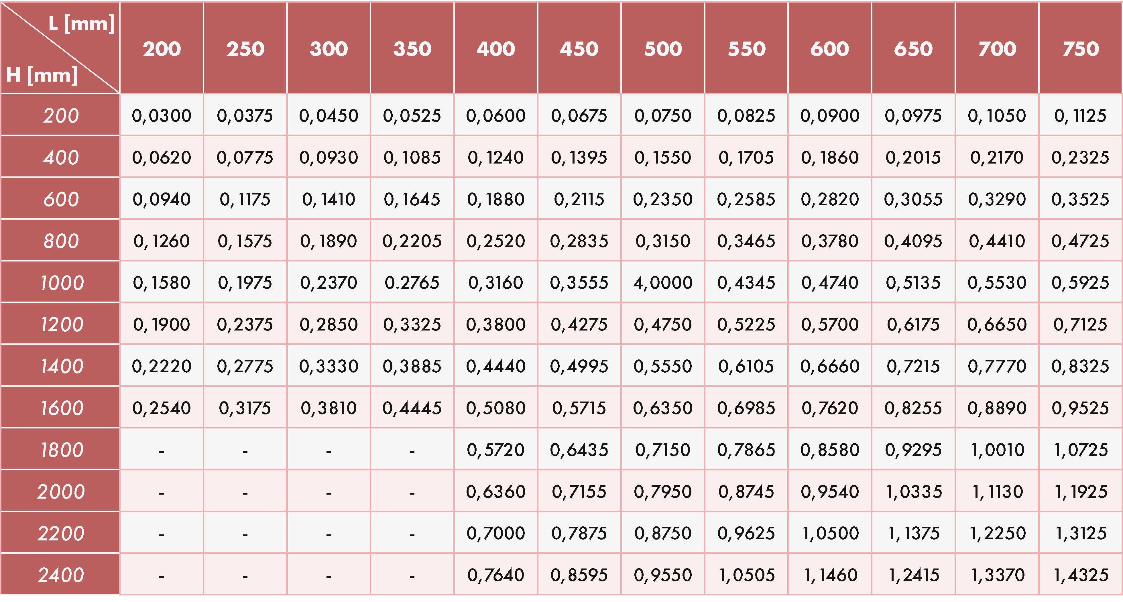 - Largura de 200 a 1200 mm, com passo de 50 mm.